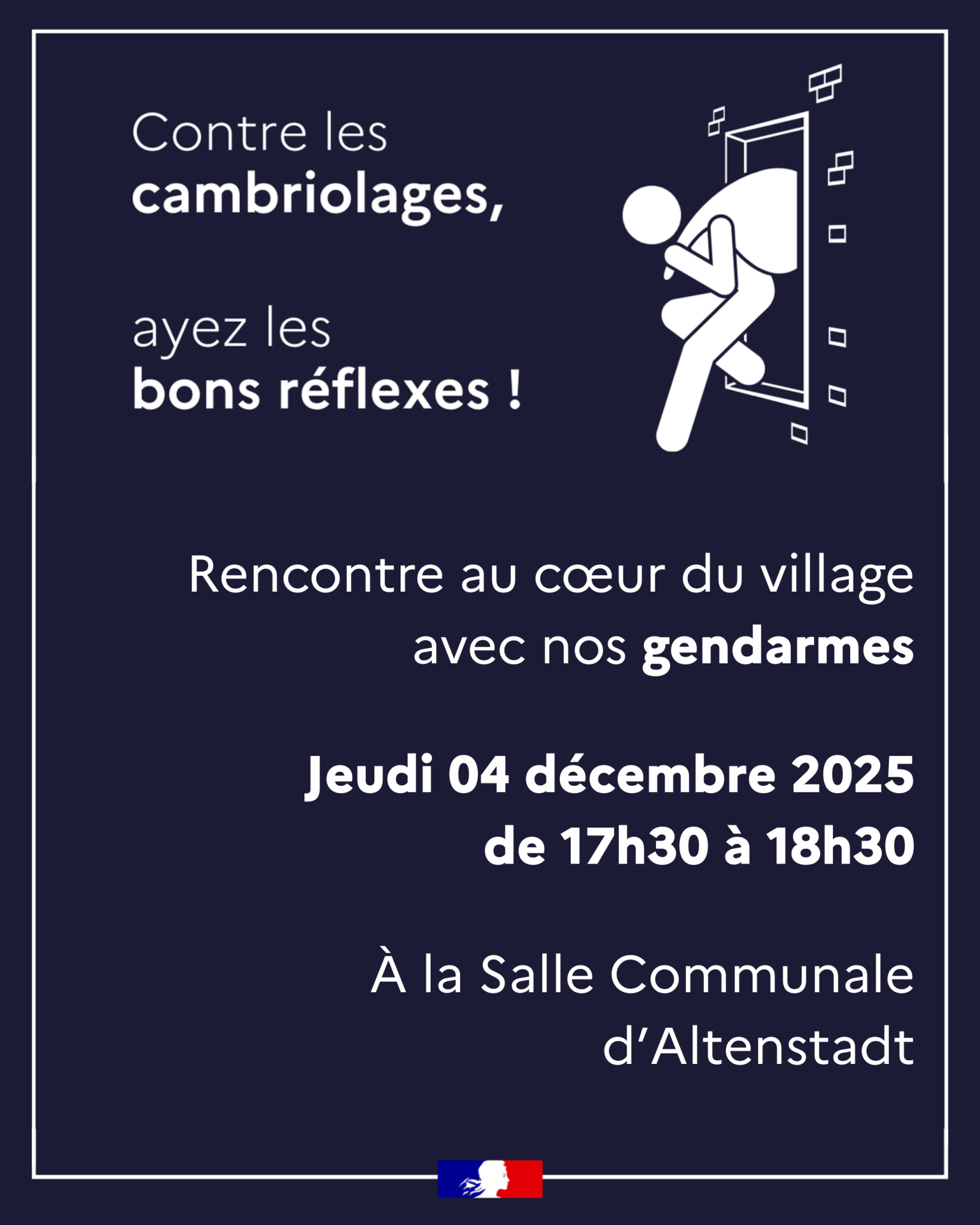 La Gendarmerie propose une rencontre avec les citoyens de Wissembourg, Altenstadt et alentours sur le thème de la prévention des cambriolages.