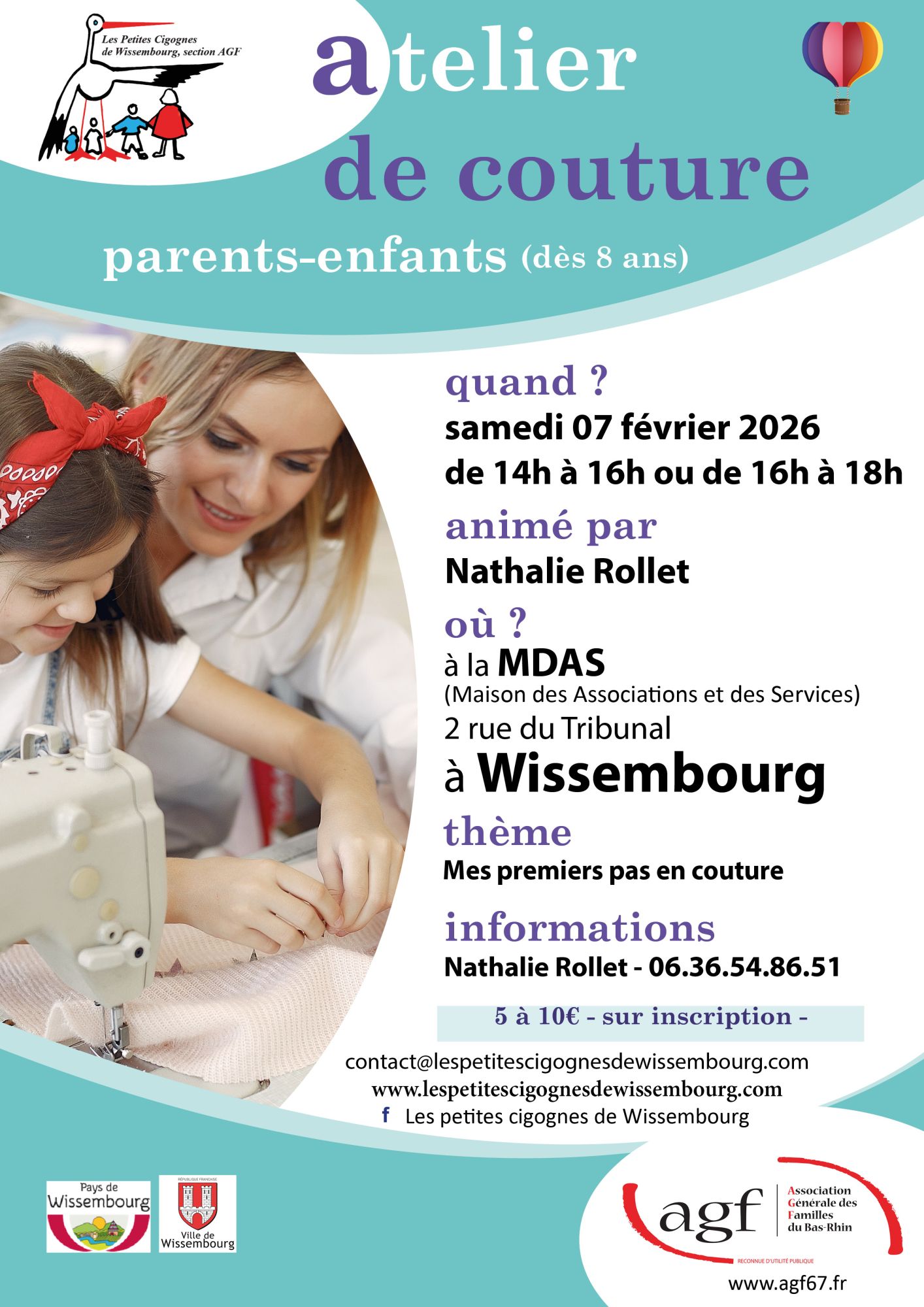 Tarif : 5 à 10€ et sur inscription auprès de Nathalie Rollet au 06 36 54 86 51 ou par mail à contact@lespetitescigognesdewissembourg.com