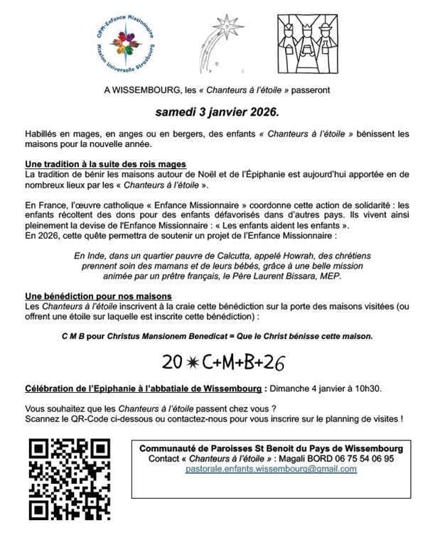 Un passage avec une bénédiction sera faite sur inscrption par les Chanteurs à l'étoile sur les maisons inscrites auprès de la Communauté de Paroisses St Benoît du Pays de Wissembourg.